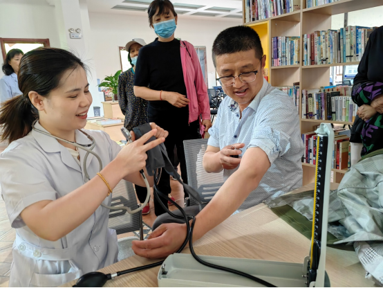 揭牌仪式进行后,护理专业师生们走进段截庄村和华府御墅社区,为居民们开展了健康宣教活动。活动中,教师代表为居民讲解了腰椎间盘突出的过程与原理,进一步普及腰椎健康意识,并为居民讲解了婴儿及成人海姆立克急救法,测量了血压和血糖,同时教师代表还详细介绍了什么是颈椎病、颈椎病的病因、治疗方法、预防措施、常见误区以及颈椎病患者的自我管理,帮助大家纠正了日常生活中的一些不良习惯,提醒大家不要做“低头族”,要爱护颈椎,健康生活。