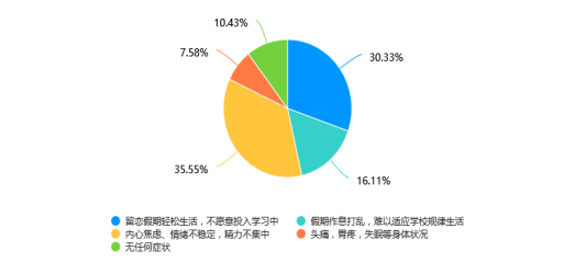 在是否存在开学前焦虑情况调研中,调研显示75.21%不存在开学前焦虑,24.79%存在开学前焦虑的情况。其中存在开学前焦虑情况的学生中,焦虑表现占比较大的是留恋假期轻松生活,不愿意投入学习中和内心焦虑、情绪不稳定,精力不集中,同时有个别同学出现身体不适症状。