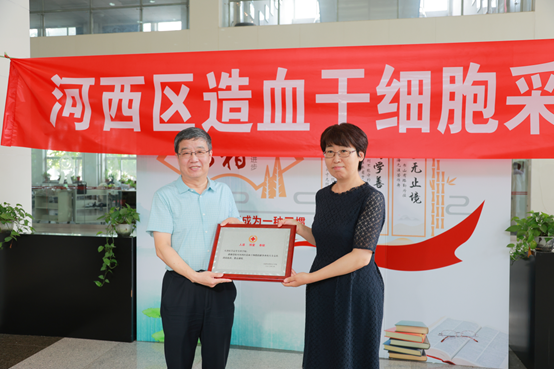 活动最后,河西区政府副区长、区红十字会长孟冬梅为我校颁发红十字会“优秀组织奖”,我校领导同天津市红十字会和河西区红十字会领导为捐献同学颁发志愿者证书。