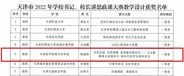 日前,市委教育工委、市教委公布了天津市2022年学校书记、校长讲思政课大赛评审结果,我校陈振锋书记讲授的思政课《对党忠诚 为国奉献 青春建功新时代 ——卫生健康事业成就非凡 新时代医学生使命担当》获批教学设计一等奖。