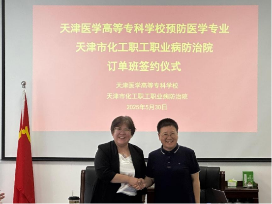 最后,在党贵奇处长及校企双方领导的见证下,李青梅书记、兰晓霞代表校企双方签订“天津市化工职工职业病防治院订单班”协议。