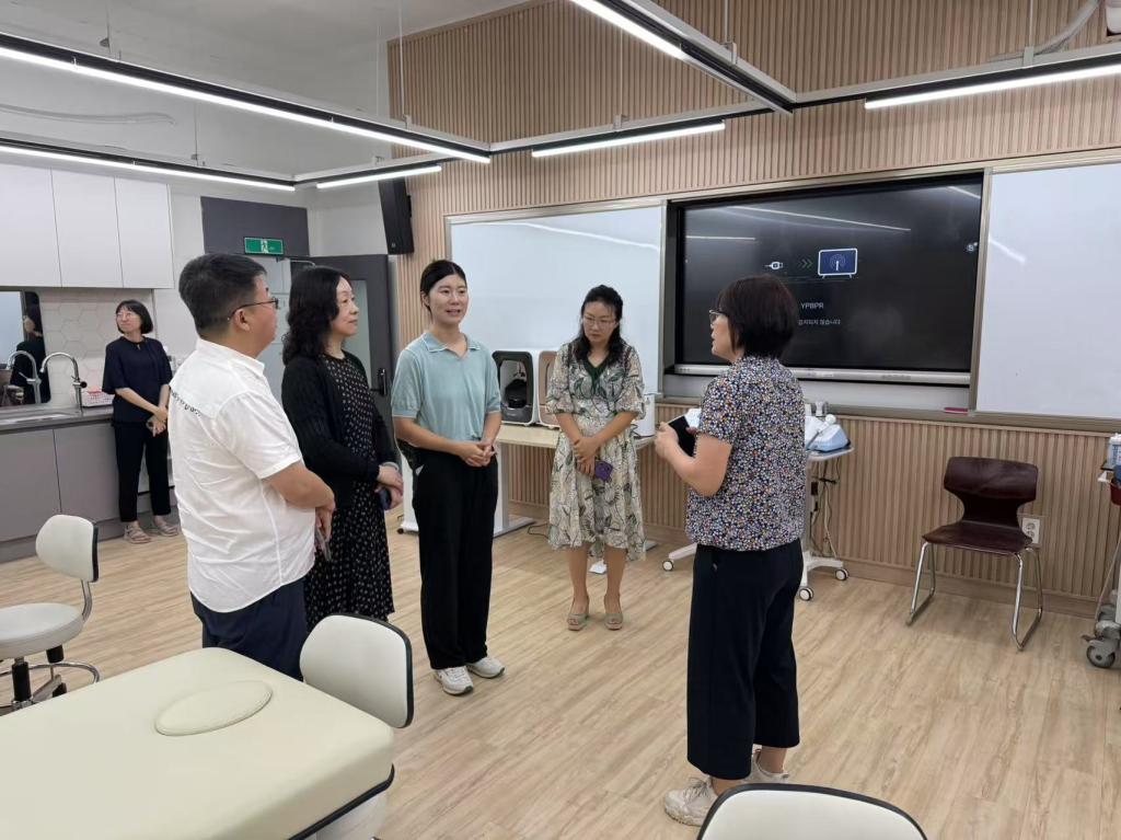 在韩国京福大学,出访团对校内实训场所、留学生活区域进行了实地参观,并和医疗美容专业优秀中国留学生进行了座谈,进一步了解京福大学的学生学习、实训、实习及生活状态,为未来拓展校际合作奠定基础。