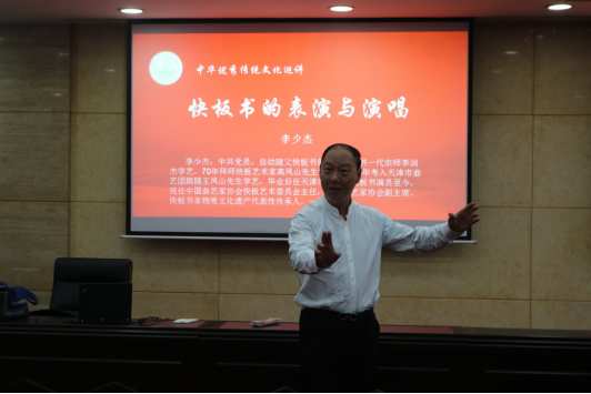 10月31日下午,2019年中华优秀传统文化高校巡讲活动“医专站”在我校第五会议室举行,活动邀请到快板表演艺术家李少杰老师为到场师生举办讲座。李老师自幼跟随其父亲、快板书创始人李润杰学艺,随后拜师快板艺术家高凤山先生,跟随王凤山先生学艺,现任中国曲艺家协会快板艺术委员会主任,天津曲艺家协会副主席,快板书非物质文化遗产代表性传承人,一级演员。校党委副书记、副校长左红与到场师生代表共同聆听了李老师的讲座。