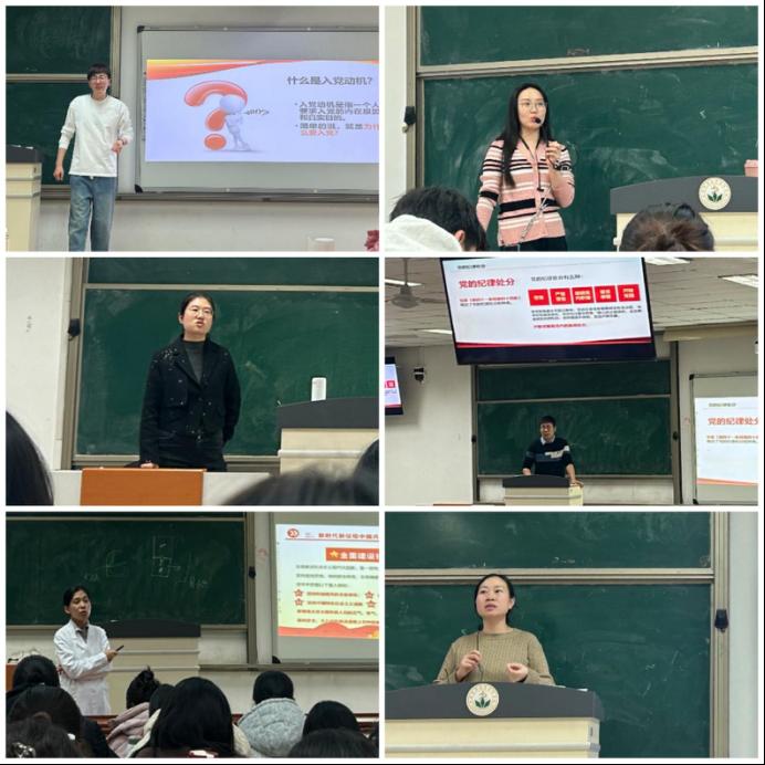 其他课程内容由校内老师讲授,内容包括《从小我到大我,谈入党动机和共产党员应有的信仰》、《不忘初心、牢记使命,争取早日入党》、《履行党员义务行使党员权利争做合格党员》、《贯彻落实党的二十大精神,发挥当代大学生先锋模范作用》、《中国共产党人的精神谱系》、《认真学习新党章,做新时代有为青年》。通过老师们的讲解,使学生更加清晰地认识到作为入党积极分子的责任、使命与担当,要将理论与实际行动联合起来,知行合一,深思笃行,为祖国的医药卫生发展贡献青春力量。