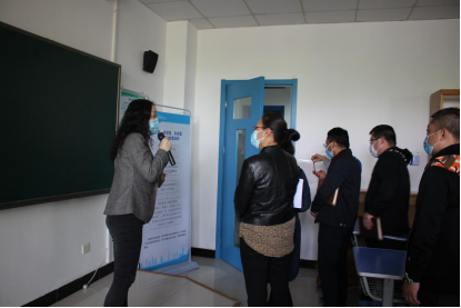 下午2点,全体参会领导老师首先对我校疫情防控工作进行实地观摩。共分为六站,分别在学校大门口现场观摩学生进入校门及出现发热病人应急处置;在设备物资处查看学校疫情防控物资专库管理情况;在临时隔离点交流隔离点的建设及管理情况;在学生食堂介绍复课开学用餐准备工作;在学生宿舍A座现场观摩学生返校办理入住手续及宿舍疫情防控演练和教学楼介绍学生复课教室环境准备工作,全程分别由校医院王珺老师、设备物资处卢勇处长、后勤处刘迪老师、柴辉老师、物业公司梁华经理和教务处景文莉处长进行详细的讲解。