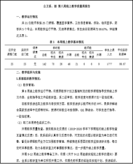 2.严格实施日报制度和教学质量周报告制度。学校严格执行日报制度和教学质量周报告制度,通过日报制,加强日常线上教学监控,对每日线上教学情况、学生上课情况、存在问题等进行监测与反馈,发现问题,及时解决。切实落实线上教学质量周报告制度,在总结本周教学运行情况、教学组织与实施、教学监控与评价、存在问题与改进措施的基础上,突出各系部特色教学活动和典型案例的交流与推广,有效实施线上教学监控与管理。