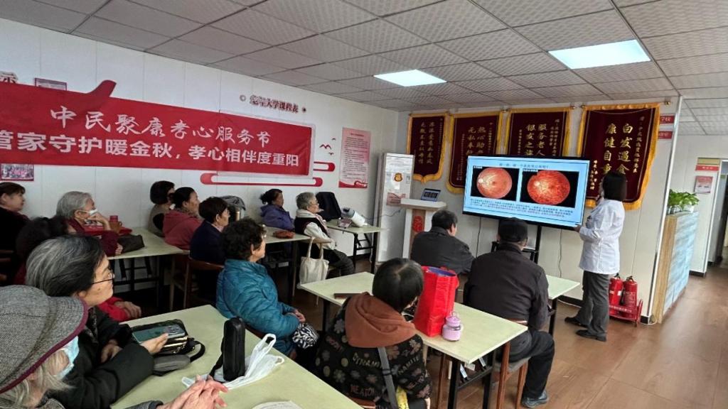 此次活动邀请到星创视界宝岛眼镜佟楼店的视光师辛丹丹医生和宝岛眼镜职教部姚心淼老师,向居民普及科学护眼知识,尤其针对老年人常见的白内障、飞蚊症、糖尿病以及高血压相关眼底疾病等眼病进行了重点讲解,传递“早预防、早发现、早治疗”的眼健康理念。