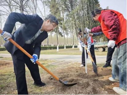 活动现场,校领导班子成员与学生志愿者代表一同挥锹栽植海棠,大家分工协作、配合默契,挖坑、扶苗、培土、浇水,每个环节都认真细致、一丝不苟。劳动过程中,校领导与同学们亲切交流,叮嘱大家规范操作、用心呵护每一株树苗,鼓励大家在劳动中体会绿色成长的意义,感受劳动创造的价值。