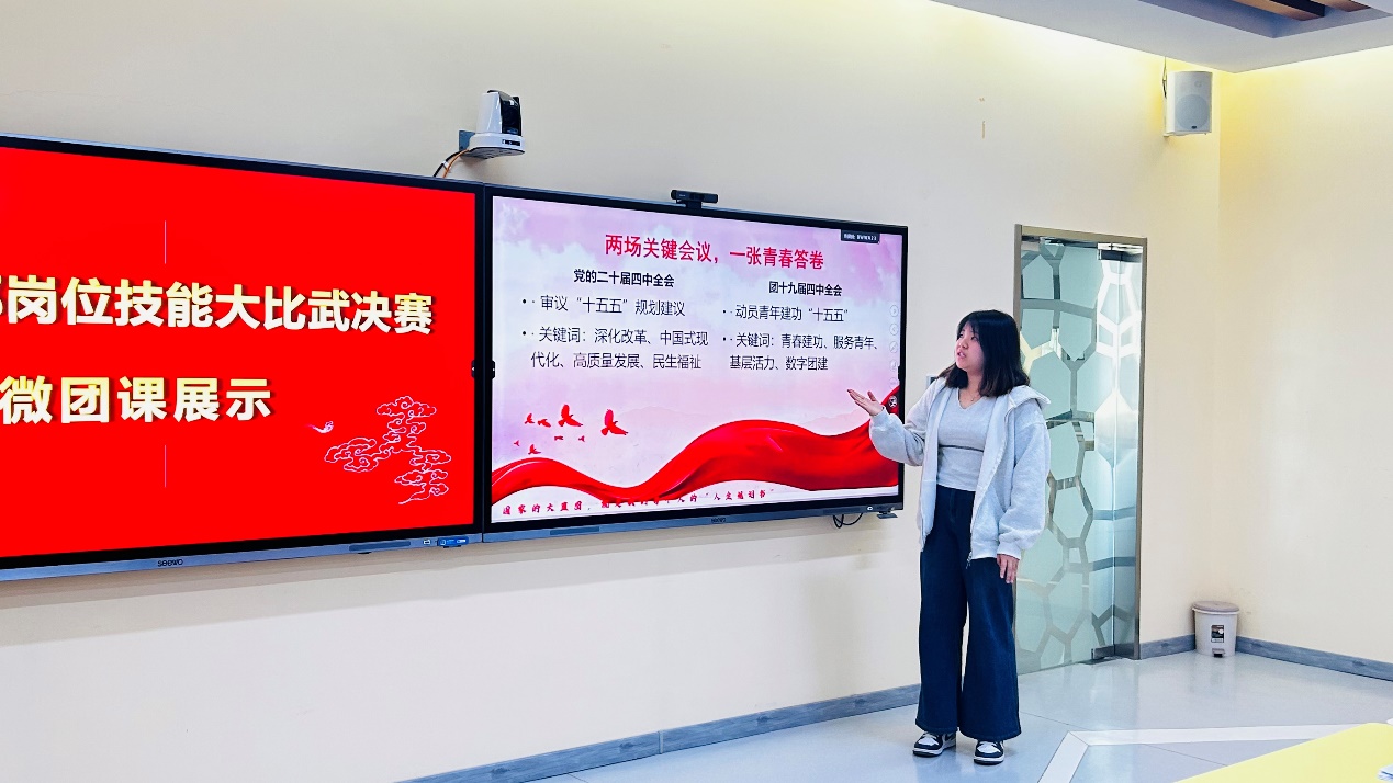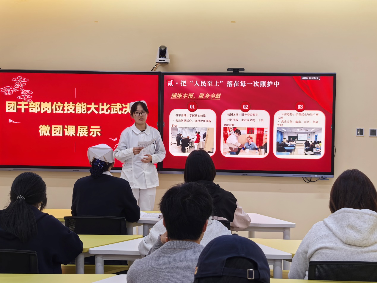 综合履职比拼包含业绩报告与微团课展示两大核心模块。业绩报告环节,参赛团干部立足团务岗位,客观总结工作成效、梳理经验不足、明确改进方向,全面展现履职尽责的实干成果;微团课展示紧扣党的二十届四中全会精神、共青团十九届四中全会精神,结合医专校园实际与青年特点,用青言青语讲理论、用鲜活事例谈感悟,创新授课形式,增强思想引领的感染力与实效性,传递青春正能量。