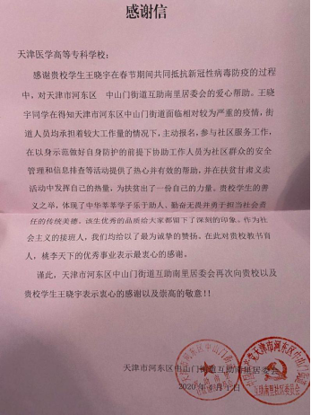 4月1日,天津医学高等专科学校收到一封来自天津市河东区中山门街道互助南里居委会的感谢信,感谢2018级护理系18182班王晓宇同学在此次新型冠状病毒肺炎疫情防控期间所做的贡献。感谢信中指出,为帮助互助南里社区辖区进行有效的疫情防控,王晓宇主动报名参加当地疫情防控志愿服务,在以身示范做好自身防护的前提下协助工作人员为社区群众的安全管理和信息排查等活动提供了热心并有效的帮助,并在扶贫甘肃义卖活动中发挥自己的热...