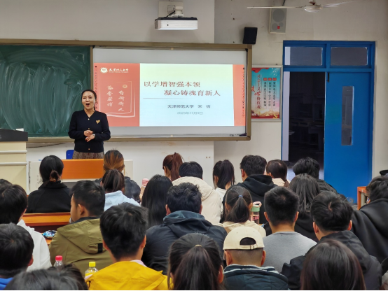 根据市教育两委《市委教育工委市教委关于开展2023年天津市“以学增智强本领 凝心铸魂育新人”大中小学优秀师生巡讲的通知》要求,我校于2023年11月9日下午在教学楼B103教室开展“以学增智强本领 凝心铸魂育新人”优秀师生巡讲活动,邀请到天津师范大学曾荣获天津市优秀辅导员的宋倩老师为我校师生讲座。各学院学生代表和全体专兼职辅导员在现场聆听讲座。