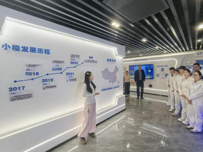 活动第二站,师生们前往天津小橙集团有限公司。集团工作人员通过图文讲解、实物展示等方式,全面介绍了集团的发展历程、核心业务布局及行业竞争力,现场展示了毫米波监测设备、防摔预警设备、防压疮感应设备等一系列适用于养老、居家护理场景的智能辅助设备,让同学们直观了解到智能技术在养老护理领域的实际应用。