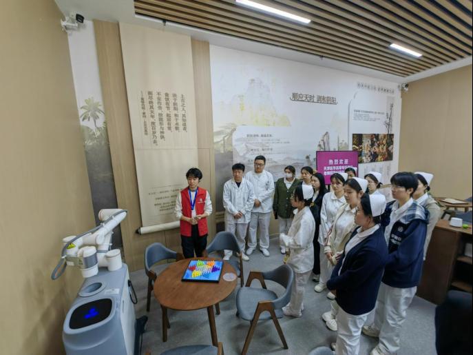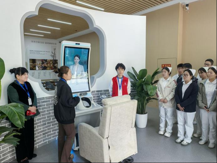 随后,师生一行前往位于河西区六合里社区的“智慧健康生活服务中心”进行深度体验。中心主管与我校护理专业2026届毕业生共同接待了大家——中心主管详细介绍了体验馆的整体布局、设施设备配置及面向社区居民的健康服务模式,我校毕业生则结合自身工作经历,分享了一线护理服务与智能设备结合的实操经验,拉近了学生与行业岗位的距离。