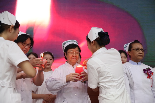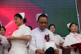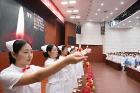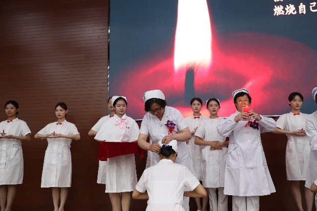 护士授帽仪式是护生成为护士的重要时刻,活动现场伴随着昂扬的乐曲声,全体护生代表依次上台,手捧护士帽,走到护理前辈面前单膝跪地,低头接受授帽。陈荣秀、夏欣华、法天锷三位前辈为我校优秀学生进行授帽。“洁白的燕尾帽象征着圣洁的天使……”伴随着神圣庄严的乐曲和饱含深情的解说,即将走上护理实习岗位的护生代表们依次上前,虔诚地接受前辈们为她们戴上圣洁的燕尾帽。在点燃代表传承南丁格尔精神的蜡烛后,教师代表王妍带领全体护生宣誓——奉行人道主义精神,坚定救死扶伤信念,遵守医德,捍卫生命,接过前辈手中的蜡烛,燃烧自己,照亮别人。