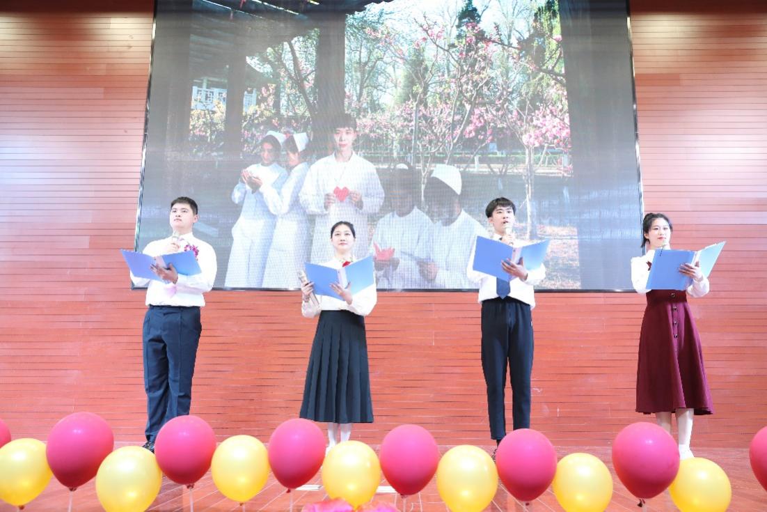 不忘护理初心,传承护理精神。《传承护理精神,续写新的荣光》诗歌朗诵节目随之亮相。师生们用生动的语言、真挚的情感和饱满的热情抒发了尊重生命、保障健康的铿锵诺言,诠释了护理工作的圣洁,深情的朗诵伴随着时而婉转优美时而慷慨激昂的配乐,扣动着每位师生的心弦。大家进一步感受到了白衣天使们忠于职守、无私奉献的高尚情操,也展现了医专学子的青春魅力!