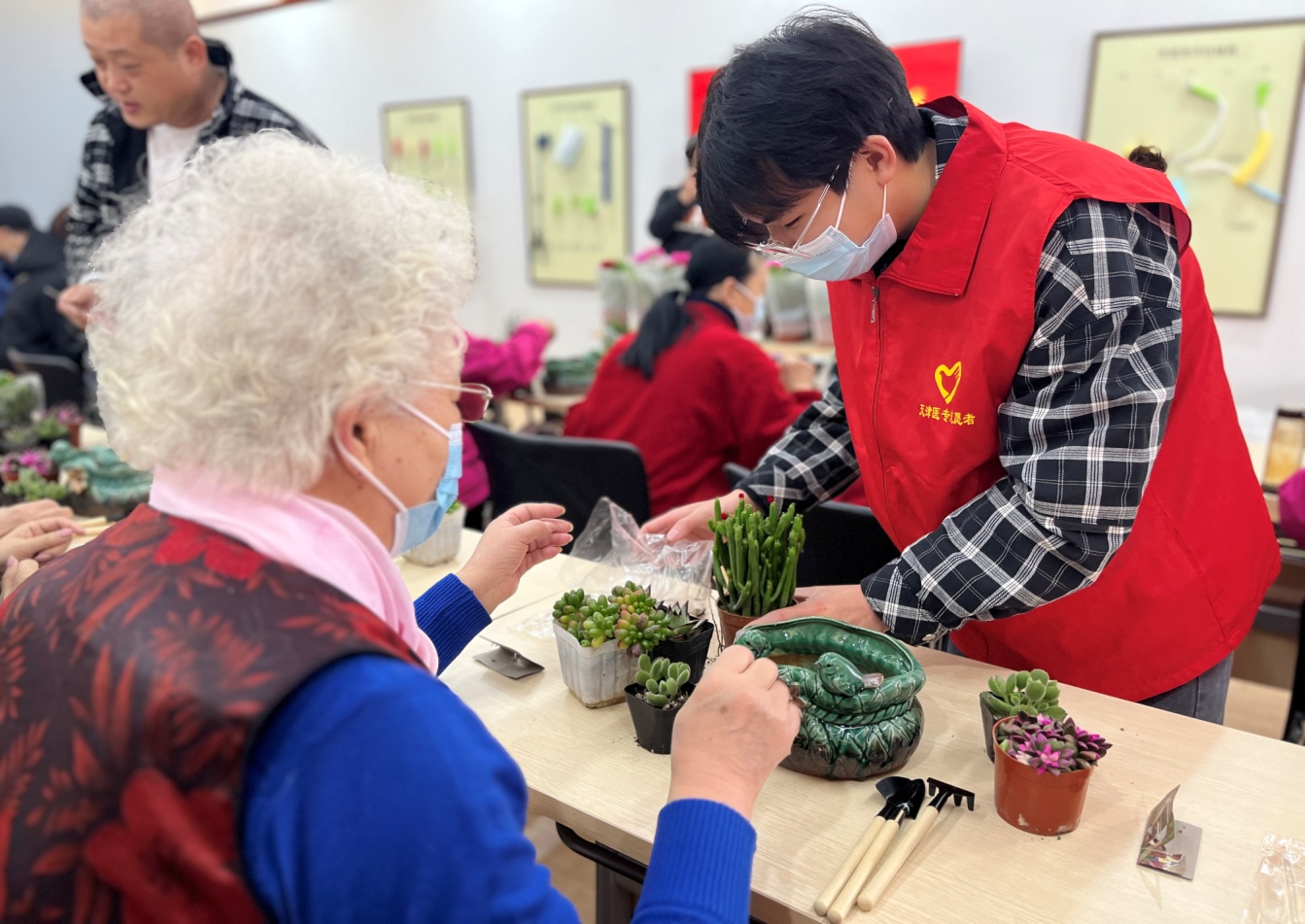 本次活动中,志愿者们协助并指导老人完成微景观插花,利用各种多肉盆栽整合在一起,老人们根据自己的审美打造了一盆盆属于自己的盆栽。志愿者们陪着老人聊天,为他们的日常生活增添了许多乐趣,也了解到了老人们的一些日常需求,为他们排忧解难。插花作品完成之后,志愿者与老人们进行合影留念,离开前,服务中心为老人们送上爱心盆栽。