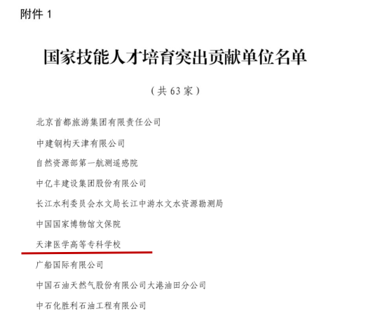 近日,人力资源和社会保障部表扬国家技能人才培育工作突出贡献单位和个人。天津医学高等专科学校荣获“国家技能人才培育突出贡献单位”称号。