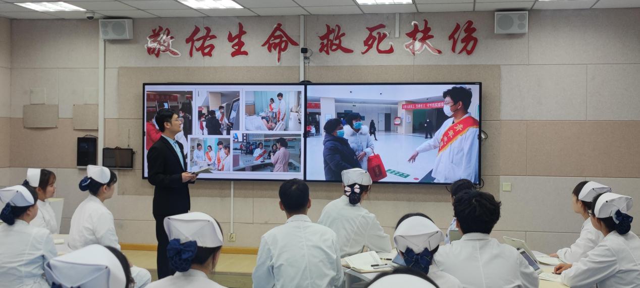 在接到比赛任务以后,参赛团队的三位老师加班加点,反复修改和完善申报材料,精心打磨参赛作品。参与课程视频录制的同学们在最短的时间内赶到学校,我校劳动教育实践活动基地——天津市胸科医院为教学视频素材录制提供了场地支持,我校志愿服务活动基地——安定医院的王娜老师作为职场嘉宾参与“互动点评”环节。辅导员沈国娴、王飞飞、祝利轻、发如合·阿迪力在学生实践环节的视频录制中给予了大力支持和协助。