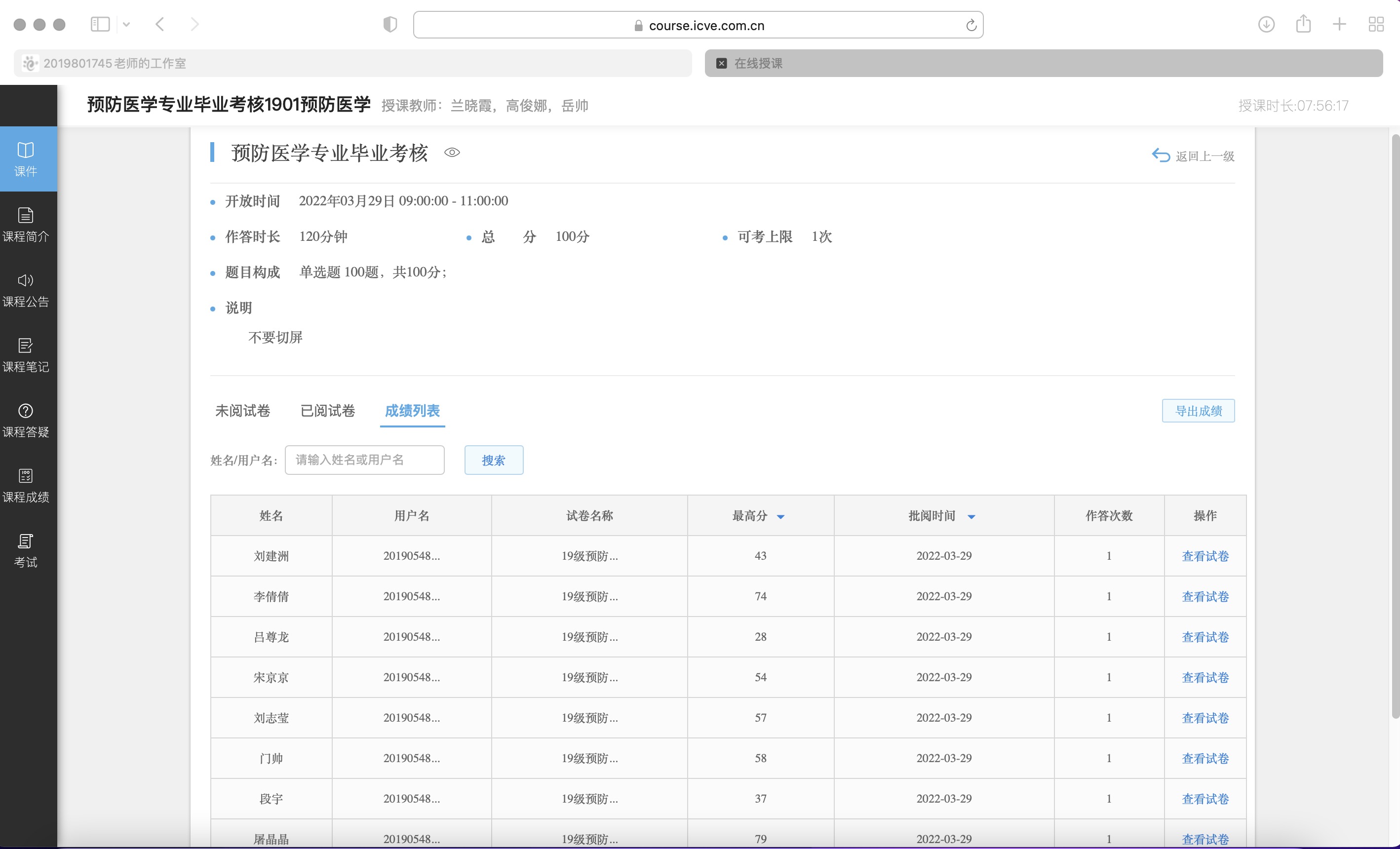 2022年3月26至31日,历时6天,卫生健康管理学院首届(2022届)预防医学专业学生圆满完成毕业考核,36名学生全员全程参加考试,并全员通过考核,其中10名学生表现优异,成绩评定为优秀。