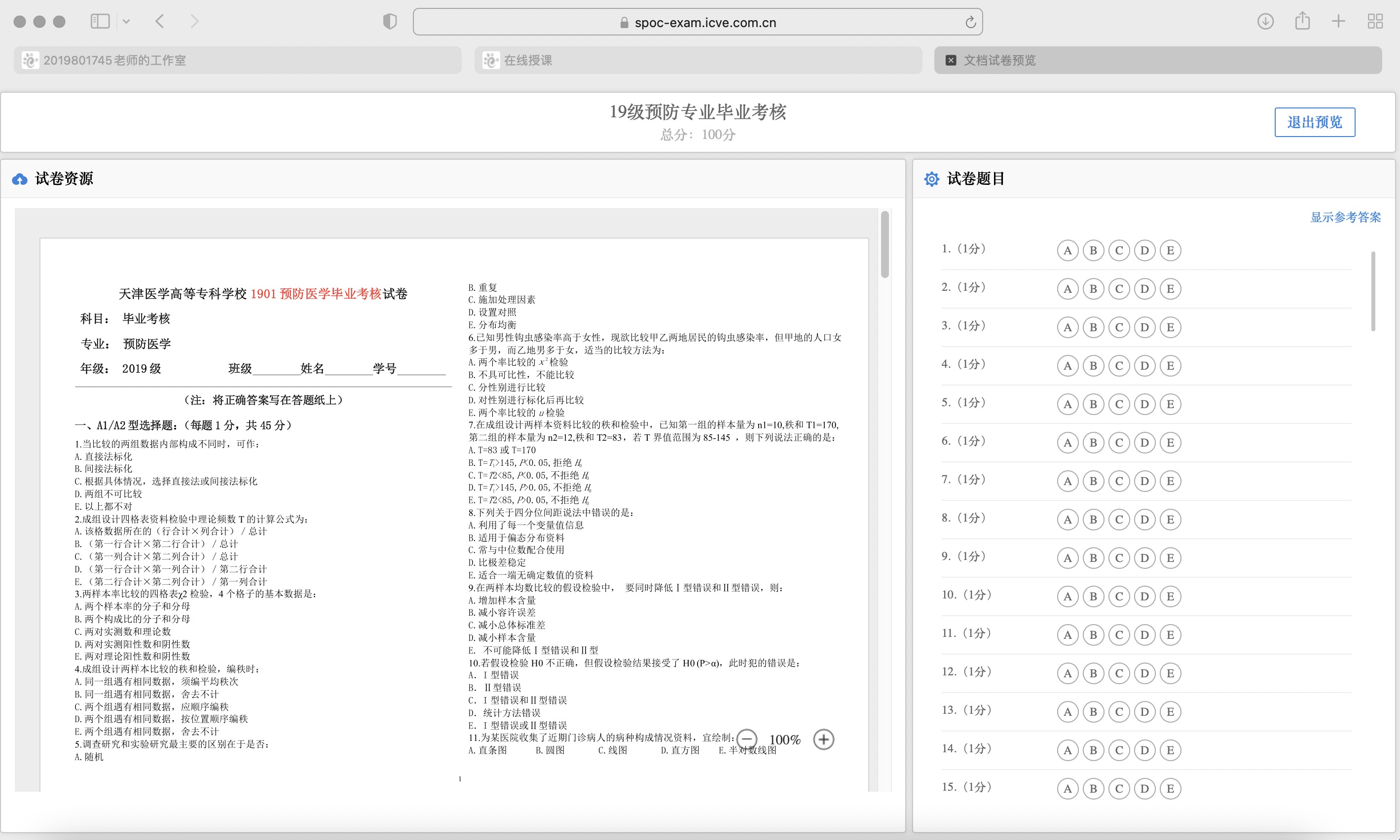 本次毕业考试组织过程准备充分、安排合理。首先,考试前,整合专业丰富的教学资源,采用职教云与腾讯会议相结合的形式,为学生开展线上培训,达到学生反复练反复学的目的。同时,为了实践技能考核对接公卫执考,特聘请多次担任公卫执业助理医师资格考官的老师,为学生指导实践技能操作。然后,针对线上考核的机位要求,采用腾讯会议的方式,对学生提前培训演练和一对一指导,确保考核时三个模块相应机位都能符合要求,保证考试的公平公正。