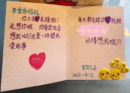 这次出征守‘沪’,家人给了我很大的支持,特别是宝贝儿子特意为我做了一张卡片。在他眼中我就是一名大英雄,承担着光荣的使命。作为医疗队员,我们一定会坚持不懈、‘疫’战到底,为重现活力上海加油。