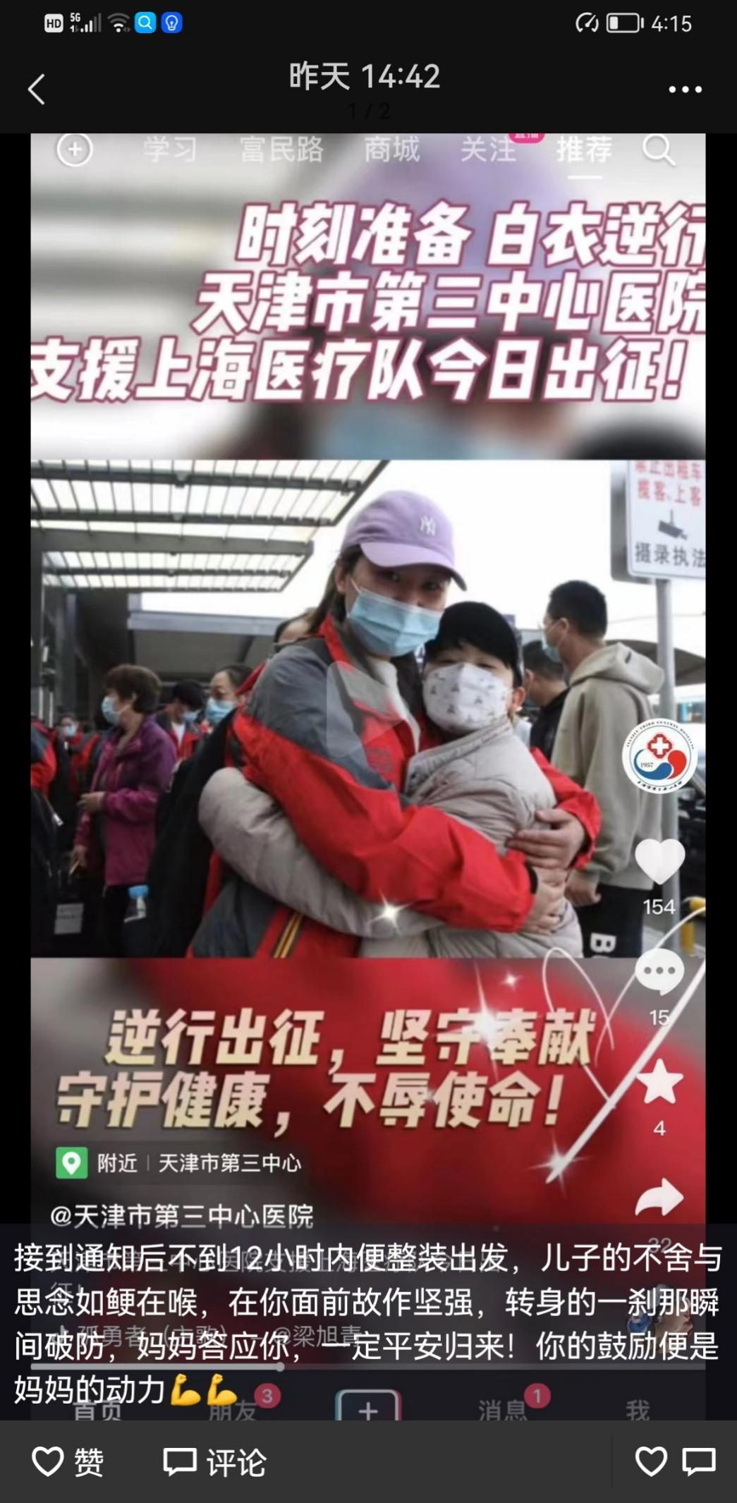 津城四月春意暖,援沪抗疫手足情。4月3日以来,为全力支援上海抗击新冠肺炎疫情,天津向上海派出了援沪医疗队。医疗队成员中有许多天津医学高等专科学校的优秀毕业生,他们从所在医院的医护岗位上主动请缨,前往上海市的方舱医院进行支援。病毒无情,人间有爱,齐心协力,共抗疫情,这些优秀的医专医学护理学院护理专业毕业生们,肩负着国家和人民的重托和使命,响应号召、逆向而行、勇往直前。他们将带着通过学校专业学习和医院工作实践所学到的精湛的技术知识、过硬的工作作风和良好的精神风貌,全力投入上海新冠肺炎患者的救治和疫情防控工作。他们用实际行动践行着“人民至上、生命至上”,践行着新时代天津医专人勇担使命的担当精神,为早日实现社会面动态清零贡献医专人的力量。