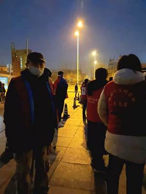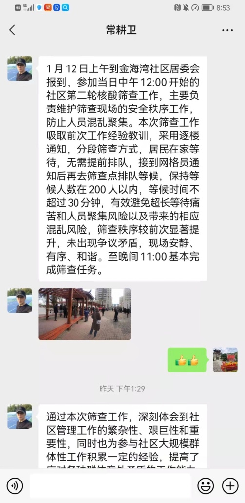 常耕卫于1月10日上午到金海湾社区居委会报到。分别于1月10日、12日、15日投入到社区的三轮核酸筛查服务工作,主要负责维护筛查现场的安全秩序工作,防止人员混乱聚集。在每次筛查工作中吸取前次工作经验教训,采用逐楼通知,分段筛查方式,居民在家等待,无需提前排队,接到网格员通知后再去筛查点排队等候,保持等候人数在200人以内,等候时间不超过30分钟,有效避免超长等待和人员聚集风险以及带来的相应混乱风险,筛查秩序较前次显著提升,未出现争议矛盾,现场安静、有序、和谐。至晚间11:00基本完成筛查任务。