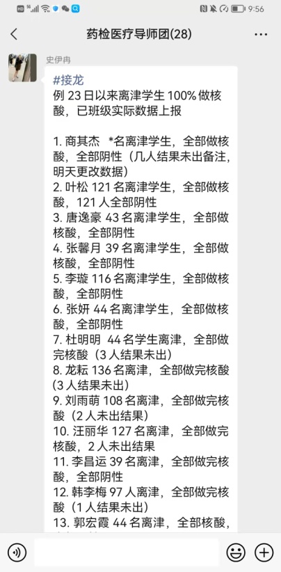 与此同时,做好留津、留校实习生防疫工作,切实将防疫要求传达到人,防疫措施落实到行动中,在采取“封控式”管理的同时,做好学生思想教育和心理关怀,组织落实全员核酸筛查工作,全力保障学生健康和安全。