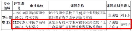 在第二批国家级职业教育教师教学创新团队课题研究项目申报中,学校作为牵头单位,联合陕西能源职业技术学院、雅安职业技术学院、宁波卫生职业技术学院、聊城职业技术学院、辽宁医药职业学院、大庆医学高等专科学校、仙桃职业学院医学院、天津市天津医院、环湖医院、儿童医院、北辰中医院、天津市残疾人康复服务指导中心共13家单位成功立项专业领域重点课题子课题:《康复治疗技术专业对接职业岗位的“全生命周期”康复模块化课程体系构建》,共同开展课程、教学资源建设,探索教学团队模块化教学实施。