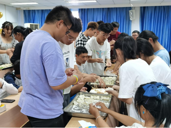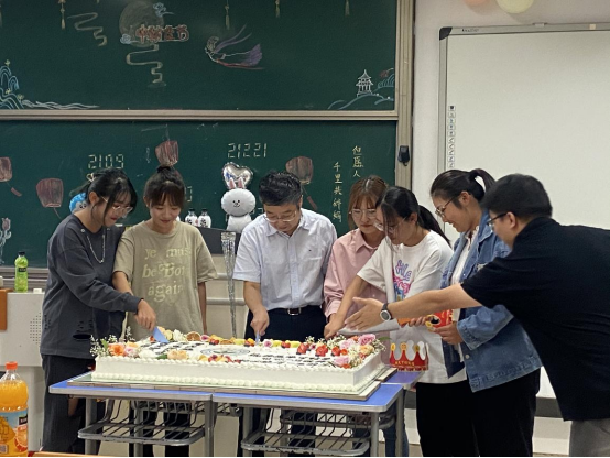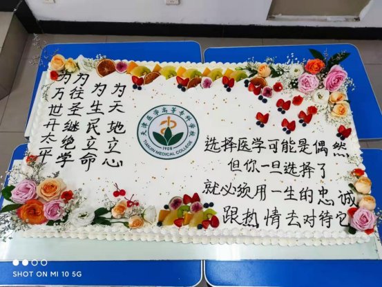 张校长对同学们提出殷切期望,期望同学们能够乘着学校“双高”建设的东风努力学习、奋力拼搏,不负学校的培养、不负家长的养育、不负自身的努力,取得优异的成绩。张彦文校长在同学们包饺子的过程中与同学们亲切互动,并同近期过生日的同学一起在精心准备的蛋糕上切下第一刀,蛋糕上书写“为天地立心、为生民立命、为往圣继绝学,为万世开太平”、“选择医学可能是偶然,但你一旦选择了,就必须用一生的忠诚跟热情去对待它”字样,寓意医术圣洁、仁心为上,同时也是学校和老师们的殷切期盼。辅导员老师还为同学们准备了中秋月饼,同学们献上精心准备的歌曲,吉他弹唱等节目,气氛热烈温馨。