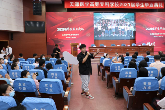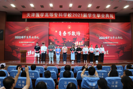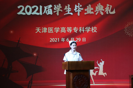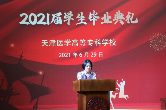 教师代表储媛媛老师也为毕业生送上临行前的祝福与期望,2021届的毕业生经历了新冠肺炎的严峻考验,也迎来了建党百年的光辉时刻,作为将亲历“两个一百年”交汇的新时代医专学子,作为奋斗在临床一线的医务工作者,希望同学们继续秉承“严谨、求实、创新、奉献”的校训,在工作岗位上践行“敬佑生命、救死扶伤、甘于奉献、大爱无疆”的医疗卫生精神。