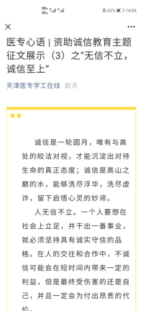 为弘扬社会主义核心价值观,切实把立德树人作为教育的根本任务,在学校形成诚实守信的氛围,我校组织开展“诚信”主题征文比赛,引导学生结合身边实例,谈诚信的意义、自身的体会。比赛时间为6月1日至6月20日,大一大二年级共137个班级参与了此次活动,经过各系初评,共推选了30篇征文参加评审,最终选出10篇优秀征文于“天津医专学工在线”微信公众号平台发表。