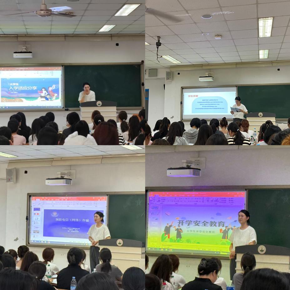 入学适应部分,老师们重点分享了大学生适应调节的实用方法,助力新生快速融入校园生活;健康宣讲环节则聚焦流行性疾病的预防与应对,明确强调了疫苗接种的必要性,以及勤洗手、科学戴口罩等个人卫生习惯和环境通风的重要性,旨在帮助新生提升自我健康管理能力;安全教育模块涵盖宿舍用电安全、消防安全与交通安全三大核心内容,其中宿舍用电安全为重点强调方向,明确禁止使用大功率电器,同时着重培养新生“隐患自查” 意识,从源头避免校园火灾风险;校园文明生活指导环节,以《校园管理条例》和《学生手册》为核心依据,明确对新生提出课堂纪律、宿舍卫生、礼仪交往等多方面要求。通过清晰的规范引导,帮助新生逐步养成自律习惯,进而共同维护校园良好秩序;针对“校园贷”“刷单返利”“冒充客服”等新生高发诈骗类型,老师们结合真实案例拆解诈骗套路,向新生传授“三不一要”应对方法——即不轻信、不透露、不转账,遇疑及时报警,并现场指导新生安装“国家反诈中心”APP;通过九三大阅兵展现的强国风采与国家公共卫生事业发展取得的卓越成就激发新生的民族自豪感,引导他们将“守护人民健康”的专业目标与国家需求相结合,厚植爱国主义精神。