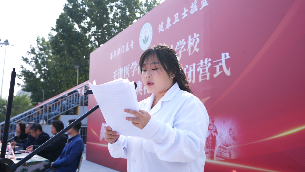 在校生代表、口腔医学2471班贾春悦同学发言,她分享了在校学习心得与生活感悟,诠释了医专学子“传帮带”的精神传承。