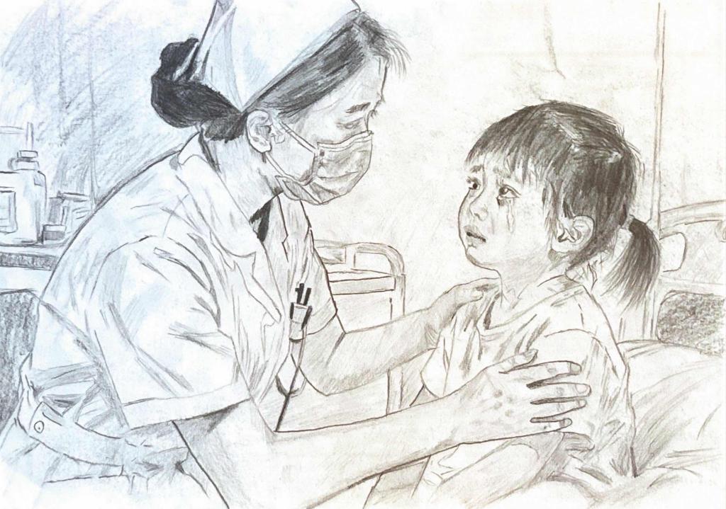 设计理念:这幅画以写实素描质感,以病房为背景,聚焦护士安抚患病孩童的瞬间,借孩童哭泣神态与护士抚肩握臂的轻柔互动,传递医疗场景的人文关怀,消解病痛冰冷。以俯身温柔神态,展现“专业+温柔”特质。作品以“医患善意联结”为核心,体现医疗人文关怀,实现职业致敬与情感共鸣。