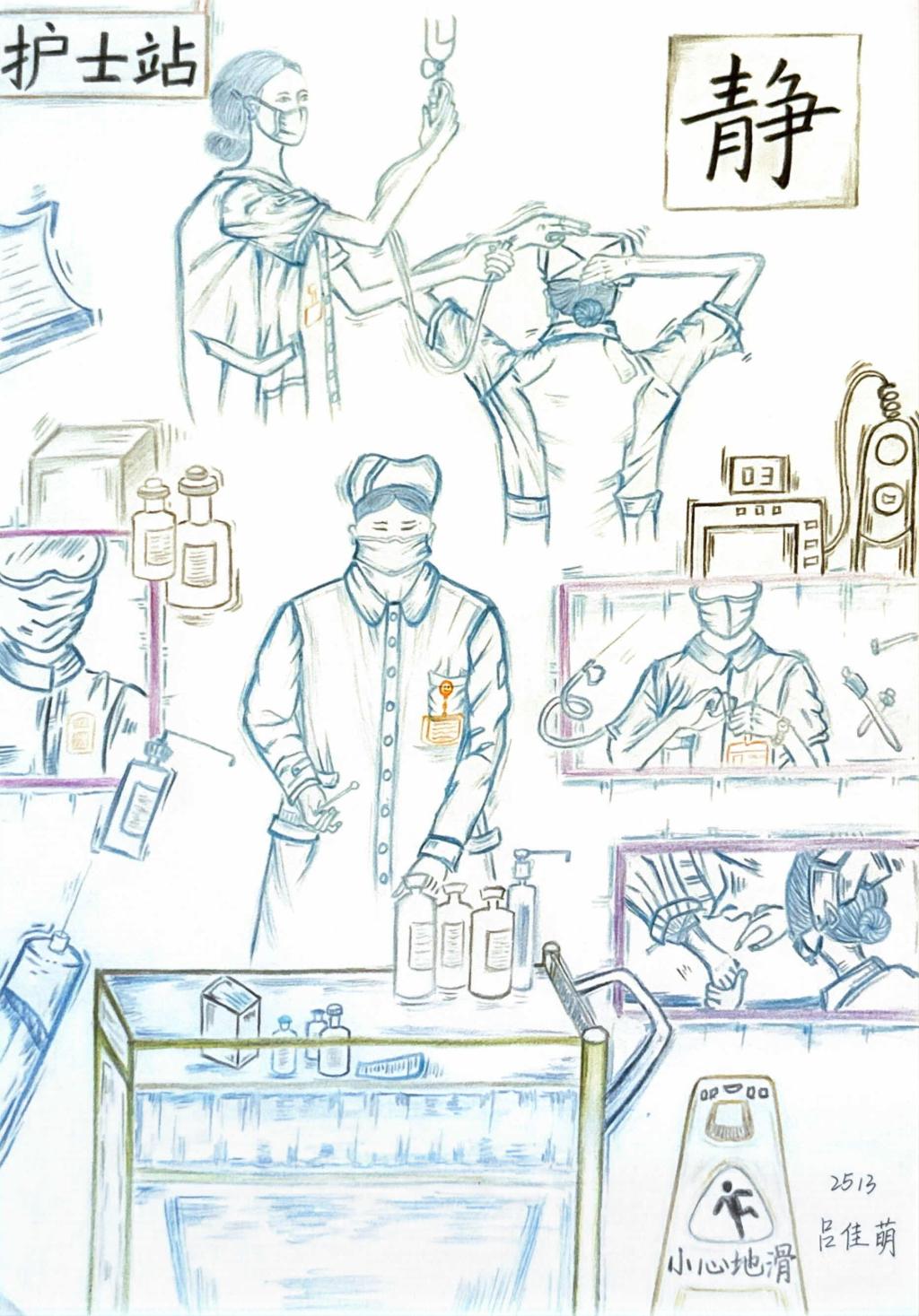 设计理念:这幅作品运用红十字、橄榄枝等元素,刻画出医护人员细心照顾病人的场景,传递温暖与希望,让大家感受到医护人员的专业和关怀,同时也让人们更珍惜生命与健康。