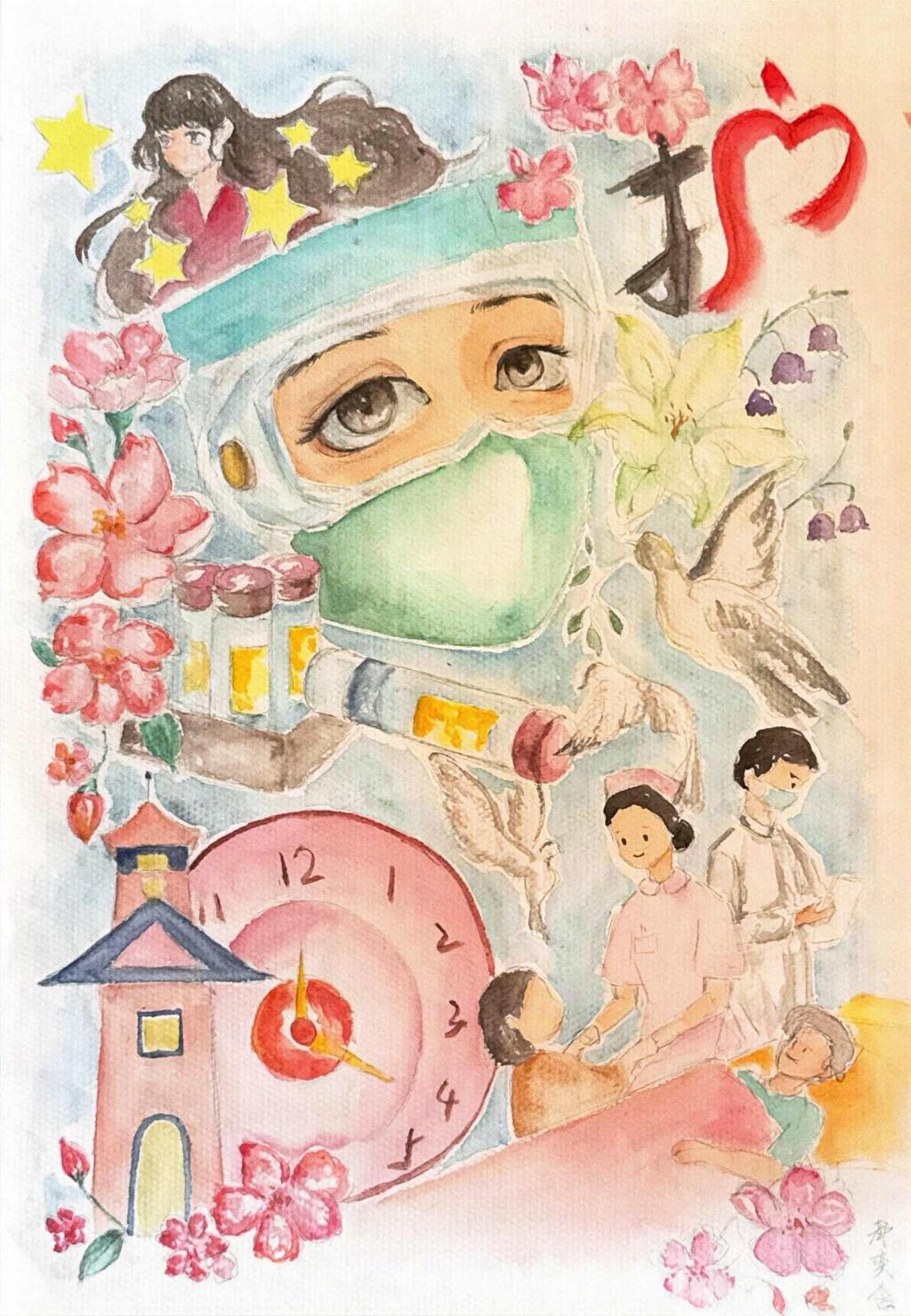 设计理念: 这幅画以水彩绘就,借医护人员的坚毅眼神、白鸽与繁花,歌颂日夜坚守的奉献。时钟与塔楼象征时间与希望,红“护”字与医患互动,传递守护生命、温暖人心的信念。
