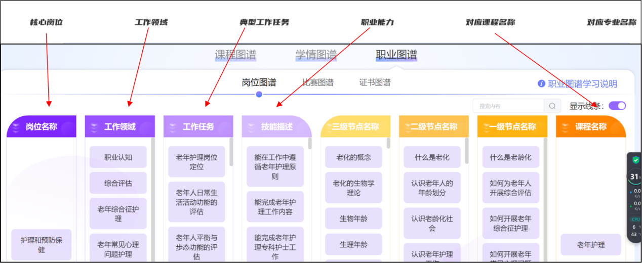 我校贯彻落实新版专业教学标准,全面修订2025级人才培养方案,围绕提升专业与产业匹配度开展调研,形成专业能力框架、岗位任务清单,绘制22个“岗位-能力-课程”关联能力图谱。在此基础上,遴选包括护理、药学、医学美容技术专业群核心专业在内的 6 个基础扎实、特色鲜明的优势专业,引入人工智能辅助手段,开发高标版专业能力图谱,研制对应岗位群的岗位能力、典型工作任务清单。同时,借助AI人才预测大模型,开展全校专业动态调整宏观分析及新专业设置分析。